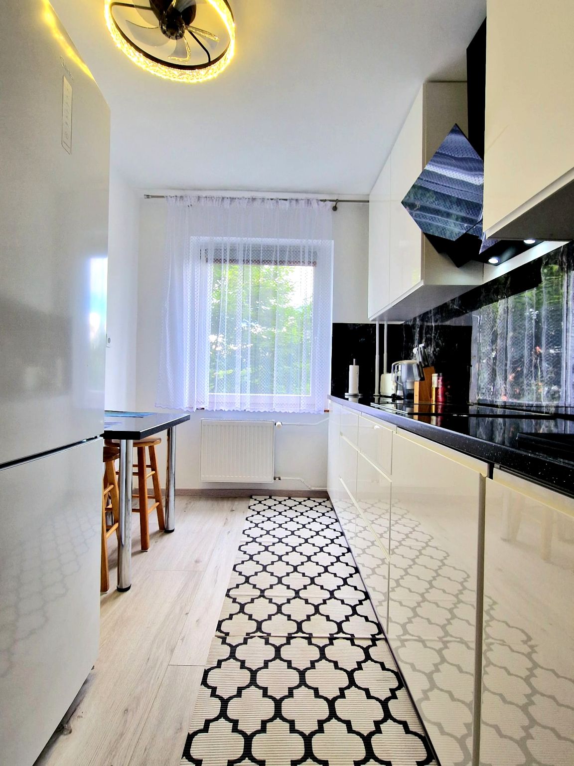– kuchnia z oknem wyposażona, w lodówkę, piecyk, piekarnik, zmywarkę oraz mikrofalówkę,