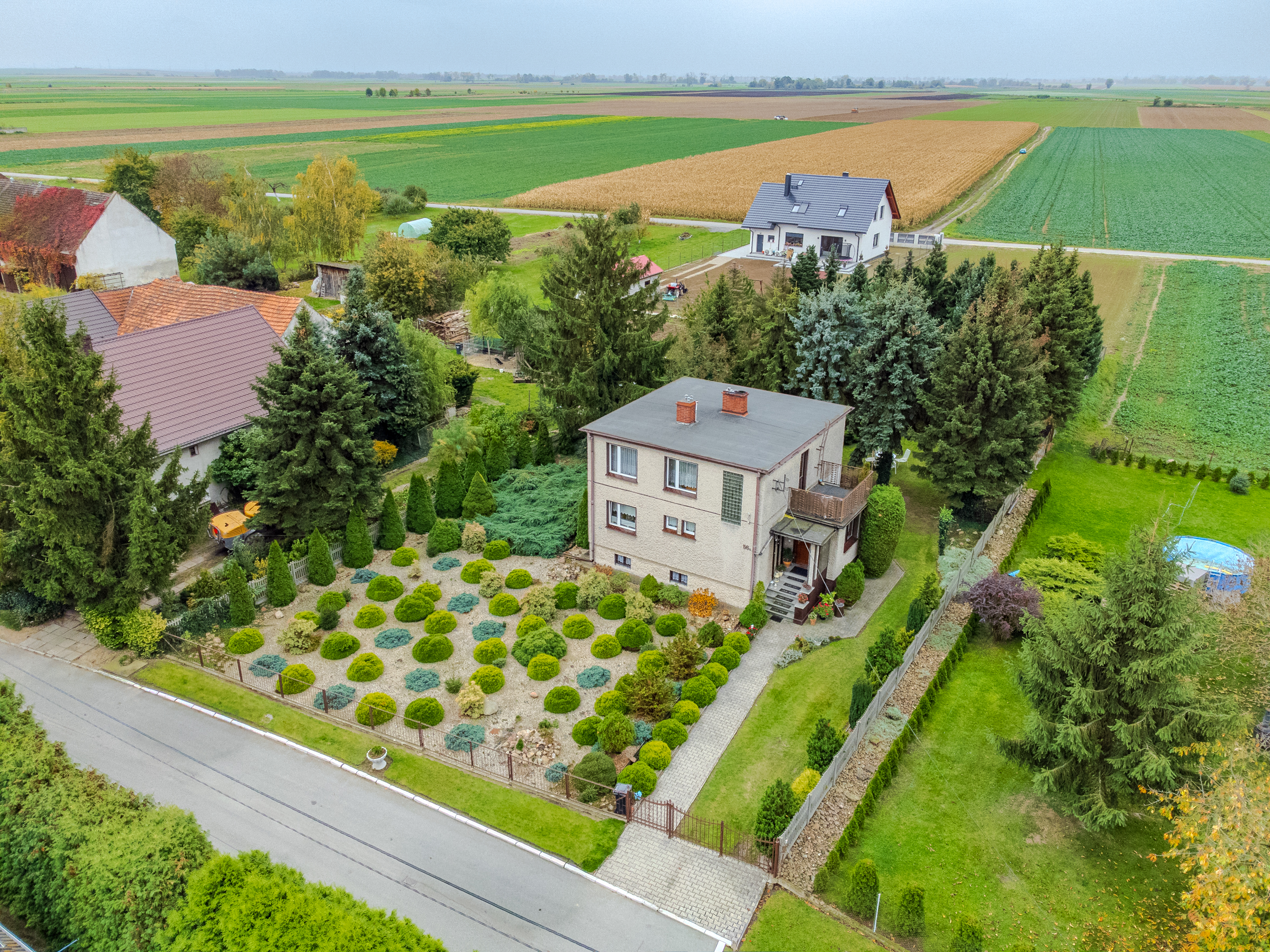 Z tyłu działki wysokie świerki, które dają cień i prywatność
